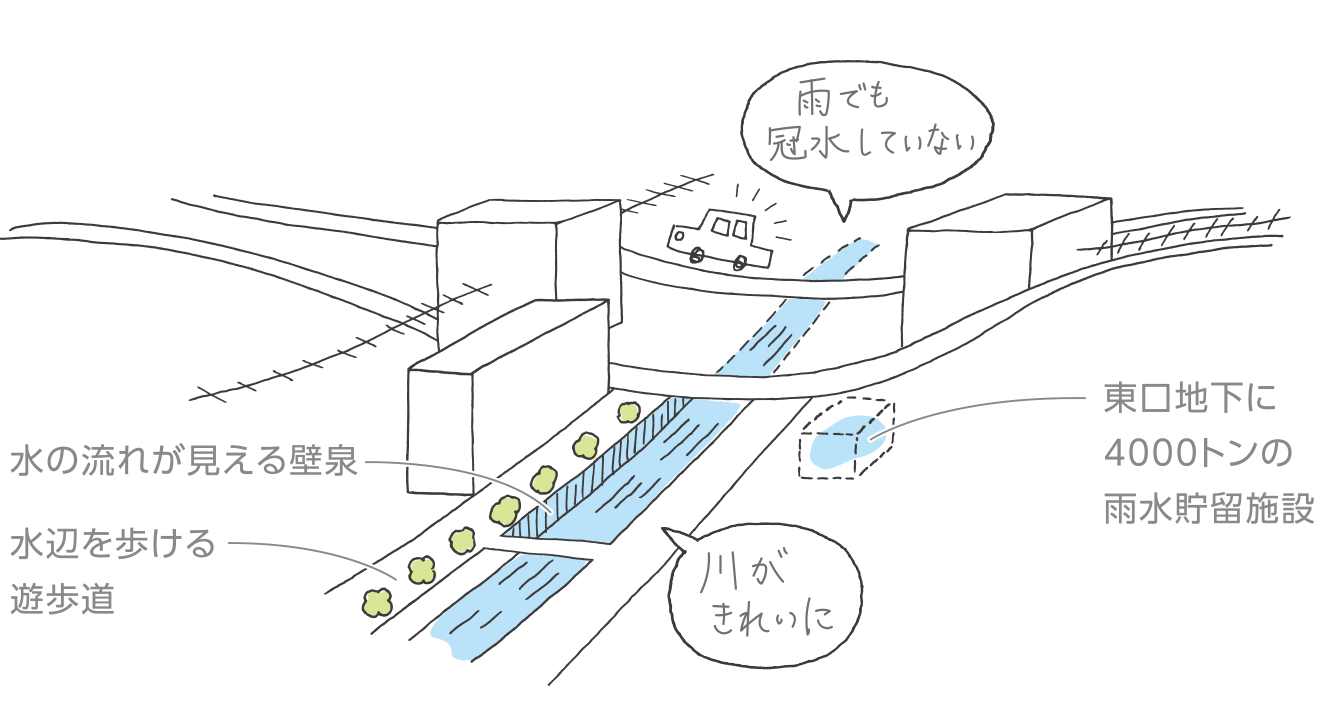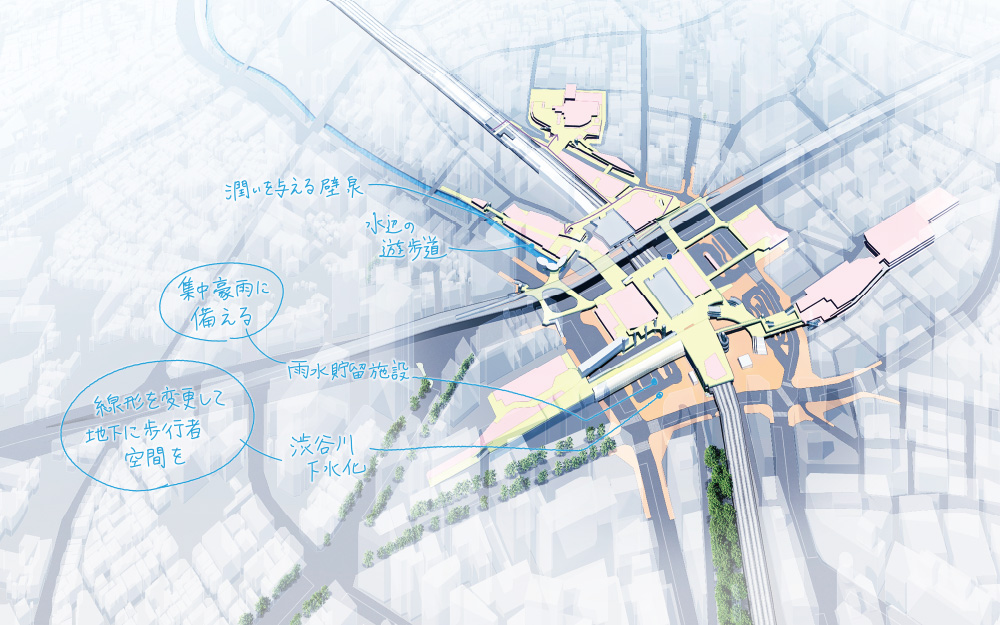 Therefore, we proposed a revitalization plan that makes the most of the Shibuya River, bringing the river to the forefront and establishing an underground rainwater storage facility to control the water that collects at the bottom of the valley.