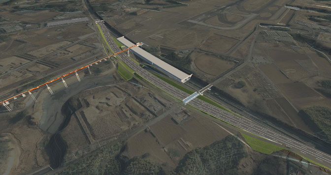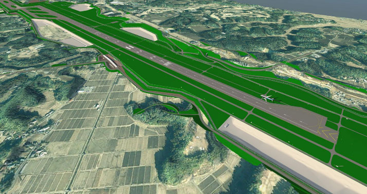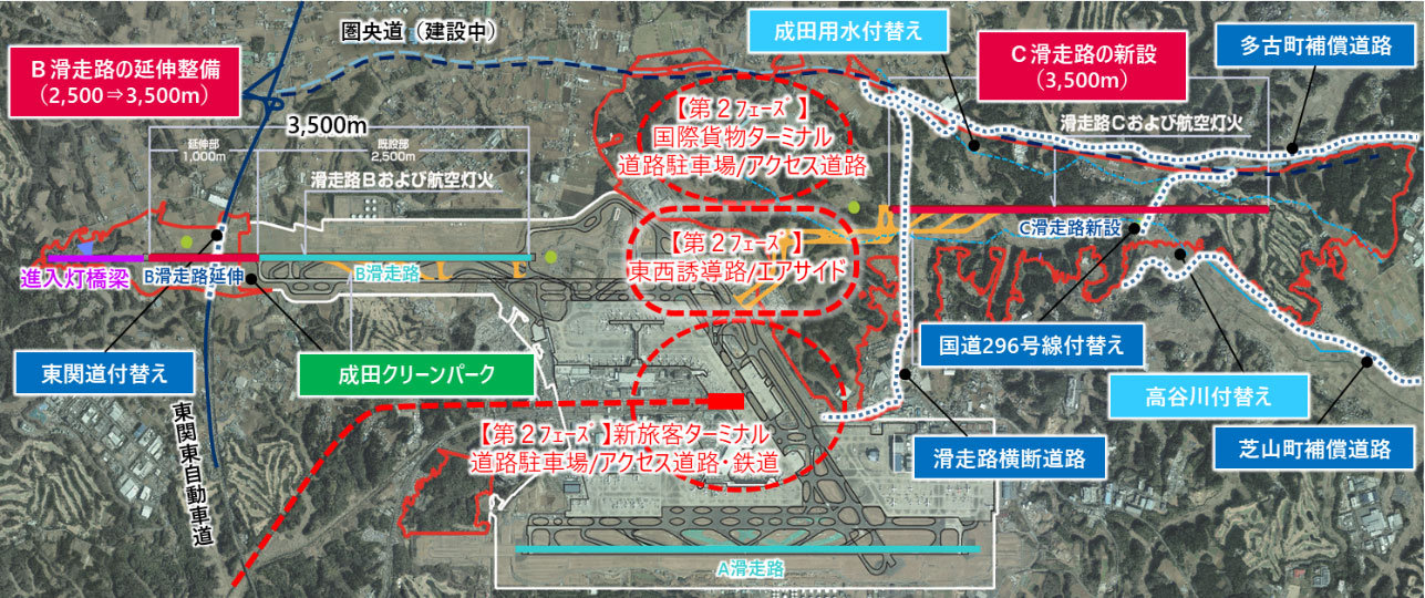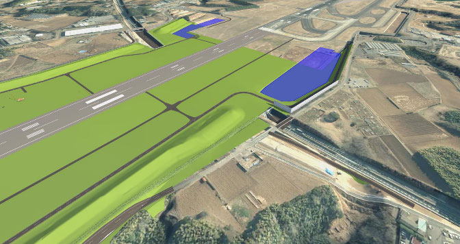 • Construction details: Extension of Runway B (runway length 2,500m ⇒ 3,500m) / Construction of new Runway C (runway length 3,500m) / Construction of new taxiways (7,471m) / Expansion of airport grounds by 1,099ha (current 1,198ha ⇒ 2,297ha)